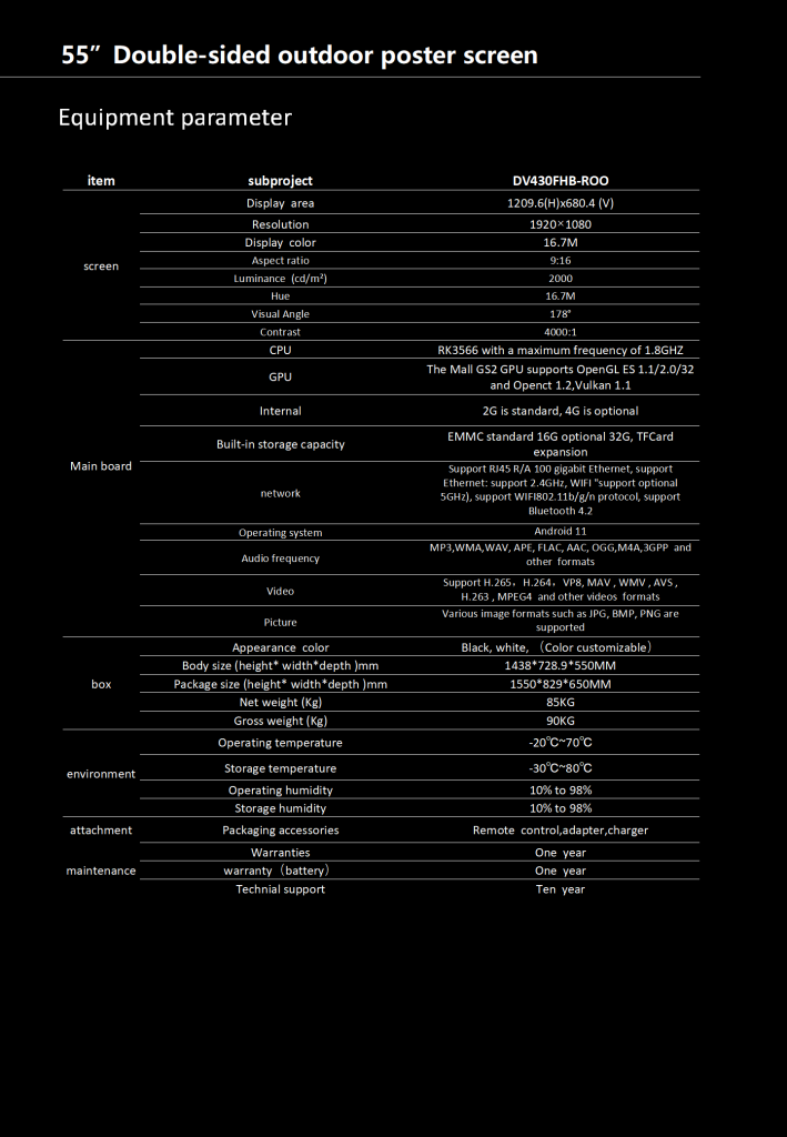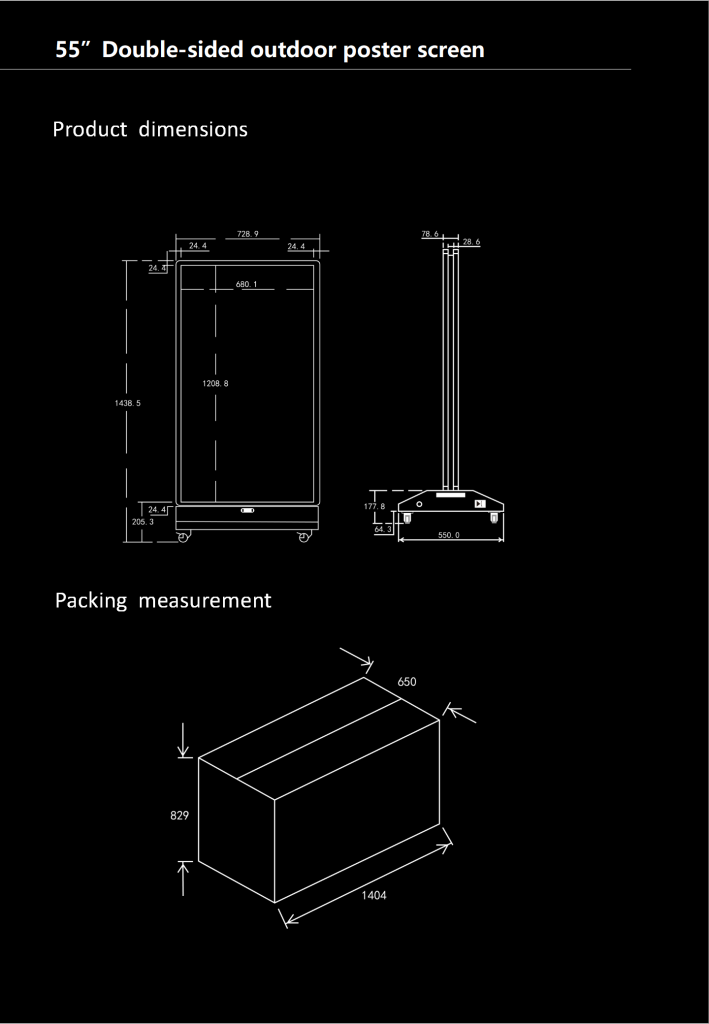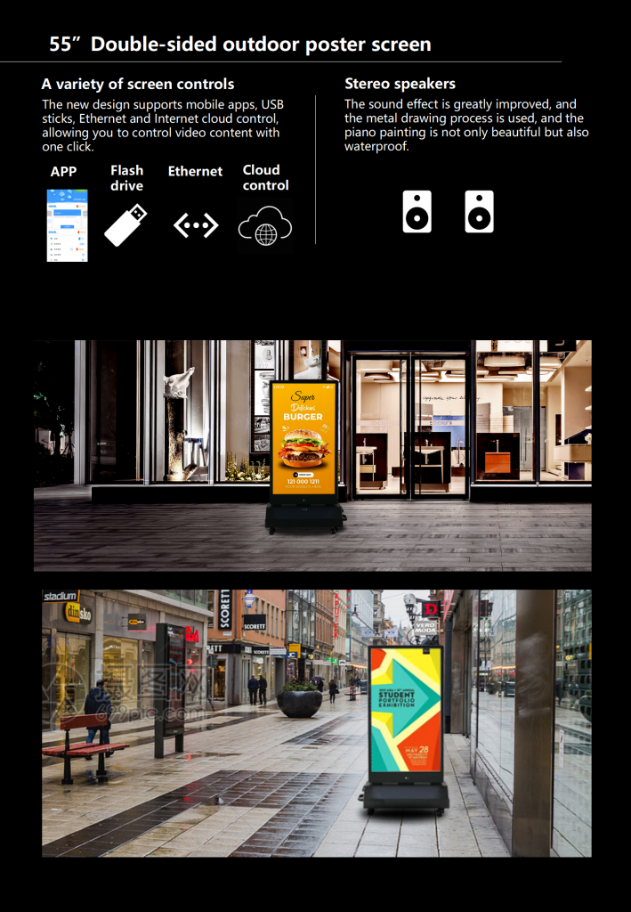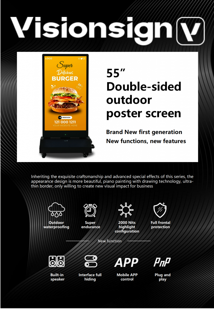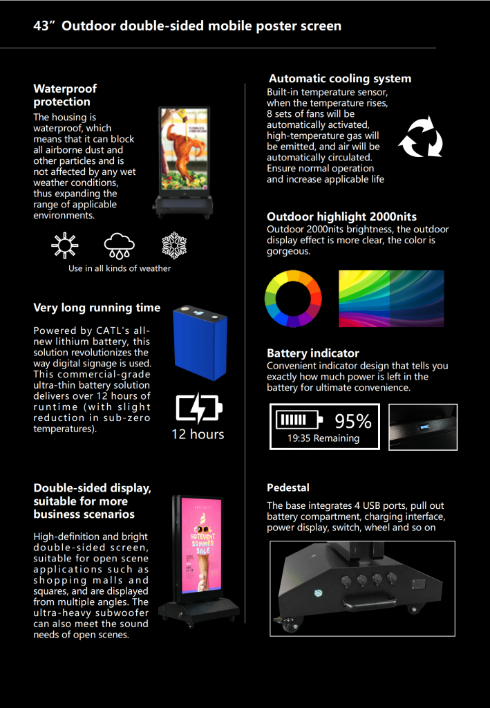 Balanced Yamato portable, 55″ double-sided outdoor product, is the largest portable series screen, with stronger visual impact, providing a very convenient use solution for flexible display of outdoor scenes