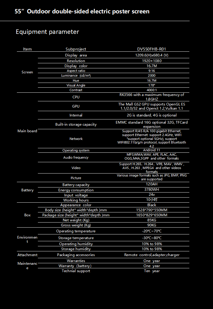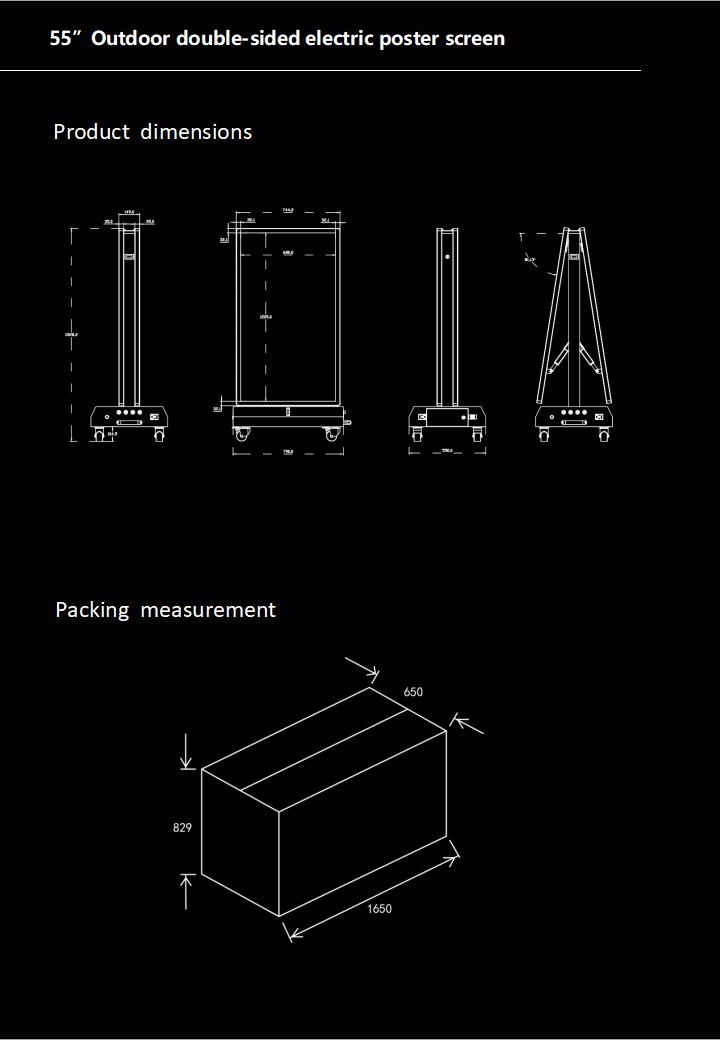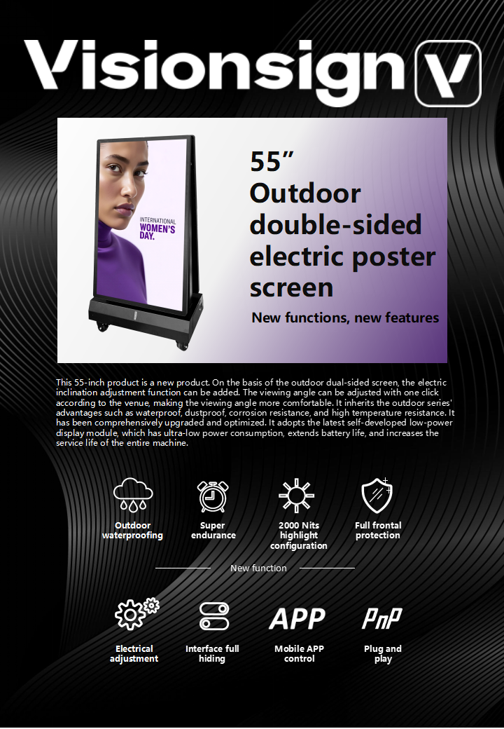 This 55-inch product is a new product. On the basis of the outdoor dual-sided screen, the electric inclination adjustment function can be added. The viewing angle can be adjusted with one click according to the venue, making the viewing angle more comfortable. It inherits the outdoor series’ advantages such as waterproof, dustproof, corrosion resistance, and high temperature resistance. It has been comprehensively upgraded and optimized. It adopts the latest self-developed low-power display module, which has ultra-low power consumption, extends battery life, and increases the service life of the entire machine.